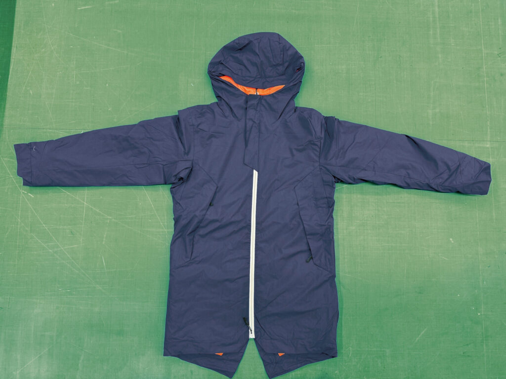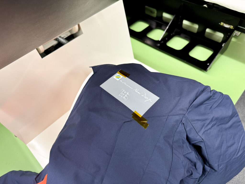 はじめにベンチコートの素材を確認します。衣類にはさまざまな素材が使われており、その素材に適したプリント方法を決めるところから始めます。
