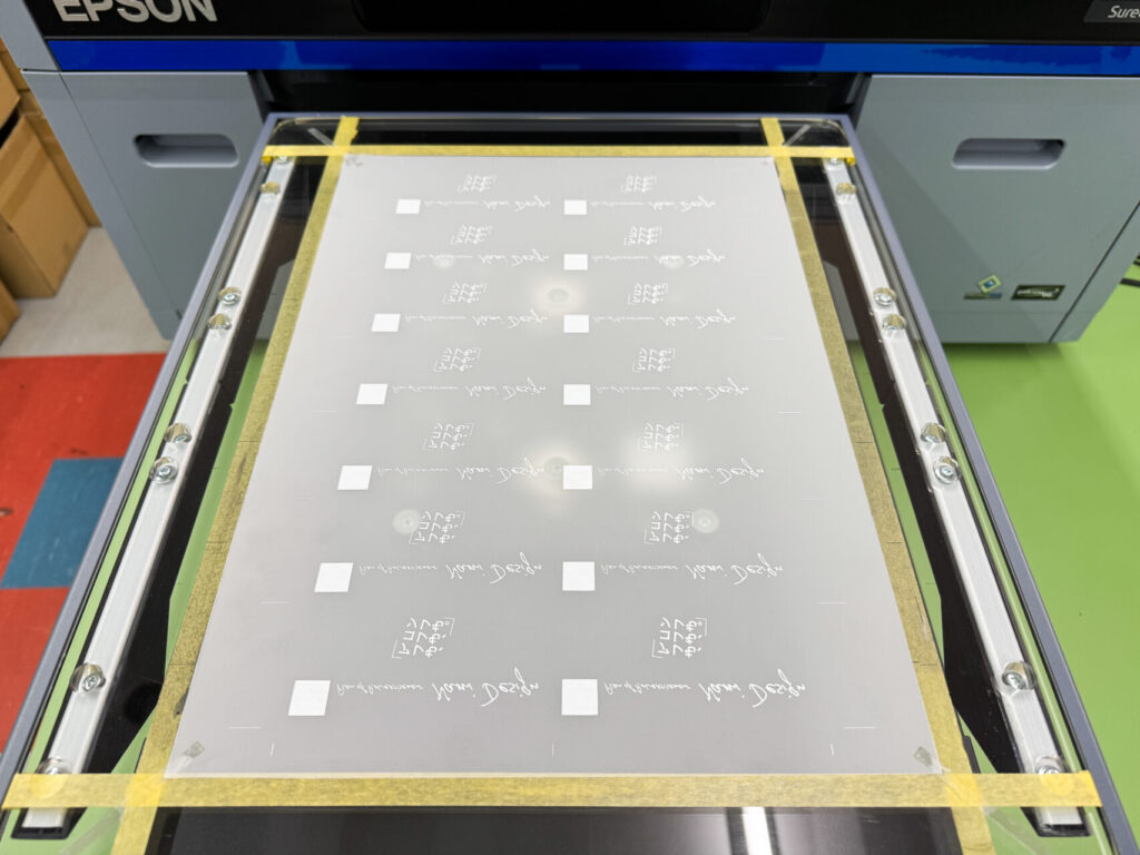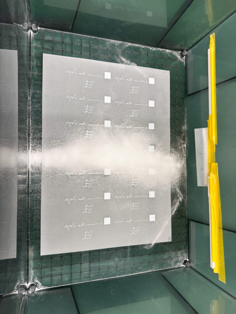 このインク部分にパウダーを振りかけ接着面を作り、転写シートが出来上がります。