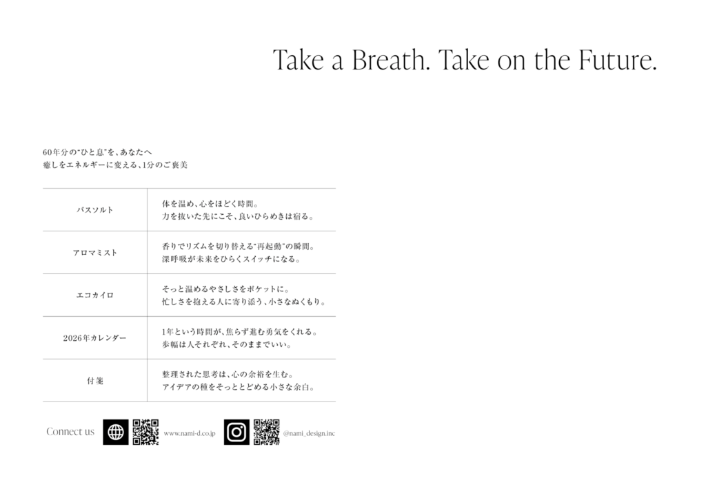 私たちが選んだテーマは「60年分の、ひと息を」。そこには「癒しは、未来をひらくエネルギー」というメッセージが込められています。私たちが60年間、クライアントと共に歩み続けられたのは、一つひとつの仕事に丁寧に向き合う「余白の時間」があったから。常に最前線でご活躍されている皆様へ、新しい年のスタートに“「深呼吸できる1分間」を届けたい“という想いから、今回のノベルティは単なる「モノ」ではなく「時間」を贈ることをコンセプトに企画しました。
